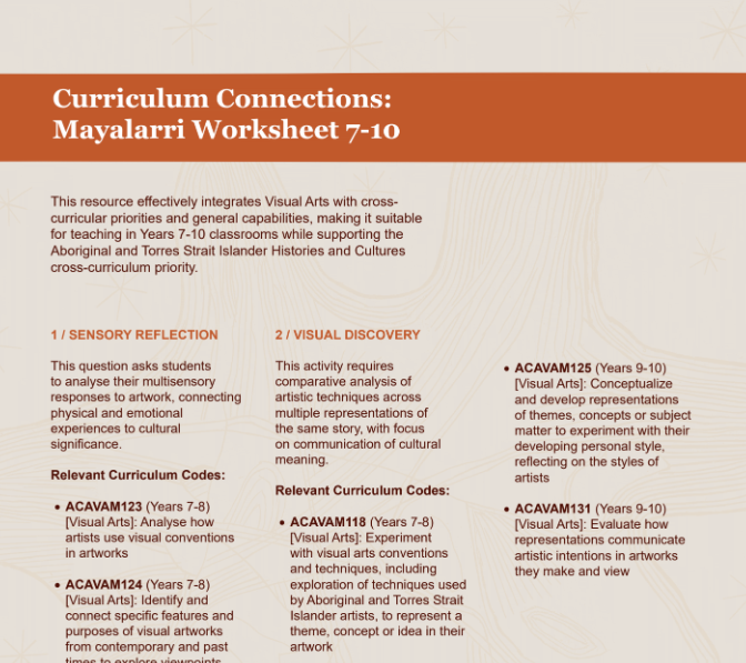 Bring the powerful stories of the Mayalarri exhibition into your classroom — or enhance your onsite visit with engaging, curriculum-aligned activities designed for students across Years K–6 and 7–10.
