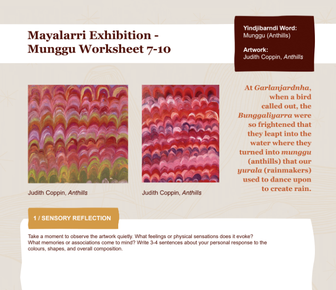 In-Classroom Experience: Worksheets can also be used remotely in classrooms around the country, introducing students to the Mayalarri exhibition themes even if they can't attend in person. Go to https://mayalarri.com.au/ to explore more of the magical Seven Sisters story.