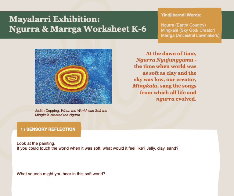 In-Classroom Experience: Worksheets can also be used remotely in classrooms around the country, introducing students to the Mayalarri exhibition themes even if they can't attend in person. Go to https://mayalarri.com.au/ to explore more of the magical Seven Sisters story.