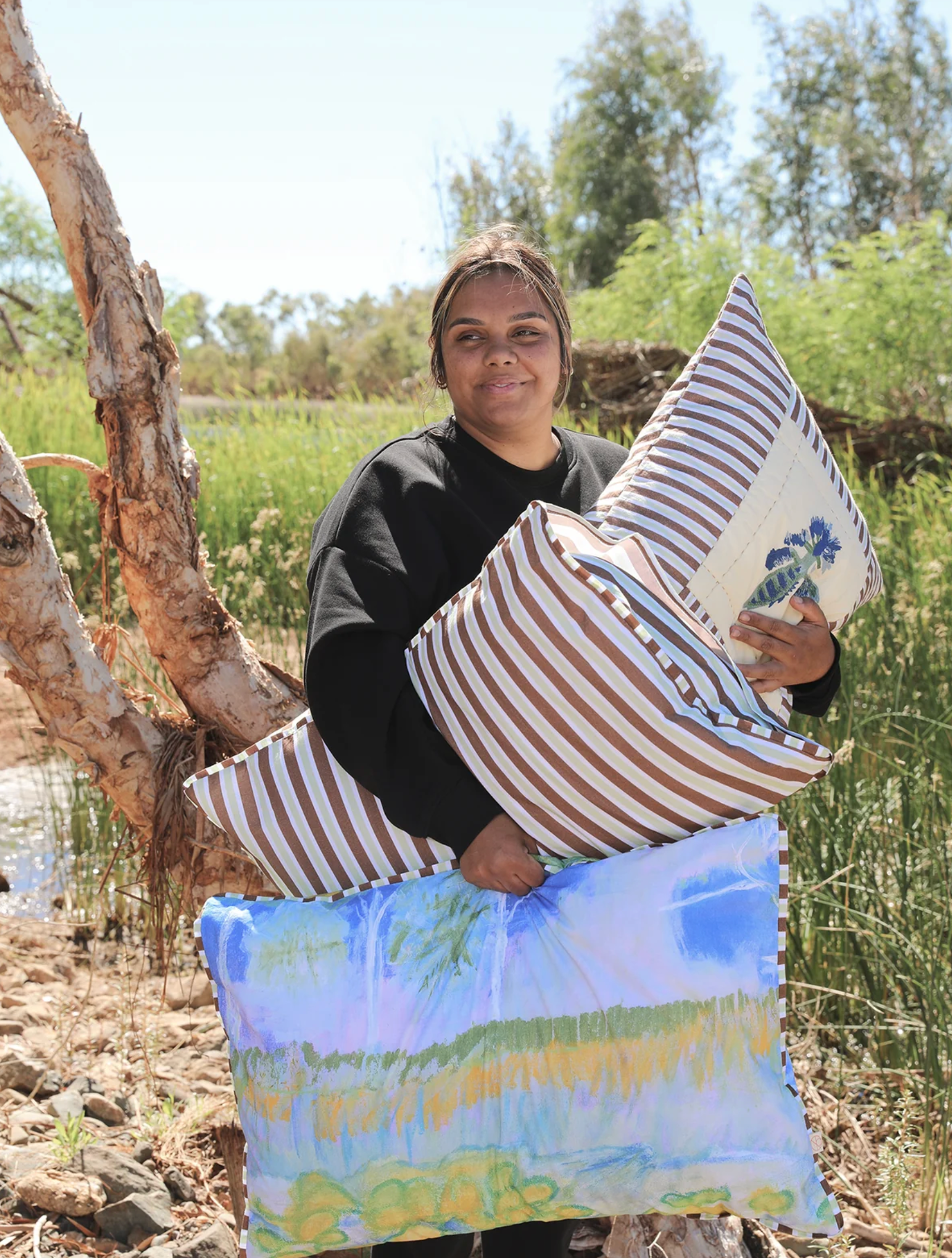 A square cushion cover crafted from organic cotton, featuring traditional kantha handstitching for subtle texture and artisanal detail, with embroidered artwork by Wendy Hubert.