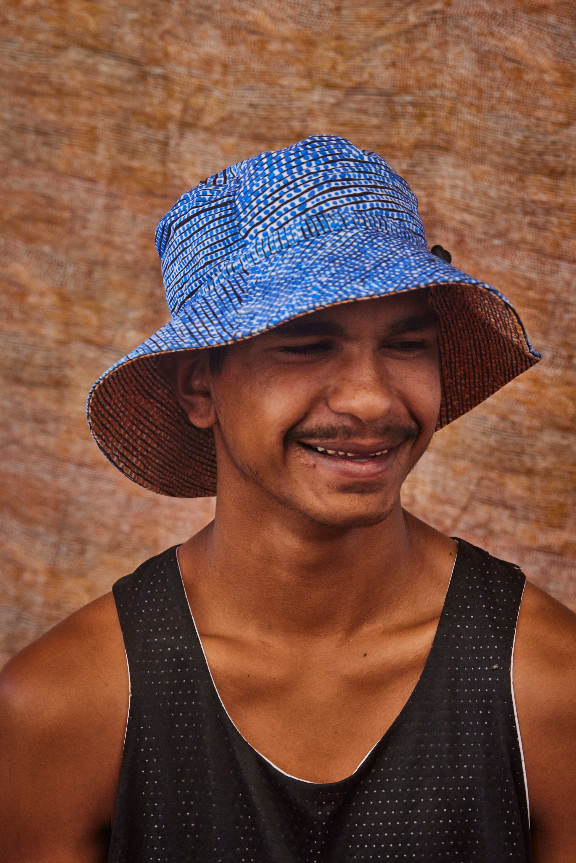 This hat was created using an original artwork by June (Moonie) Djiagween called Milky Way Ngurra Nujugamu (When the world was soft).