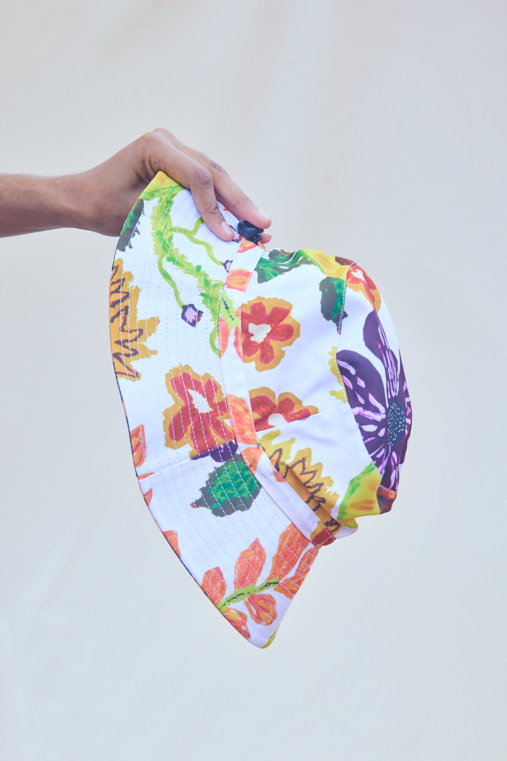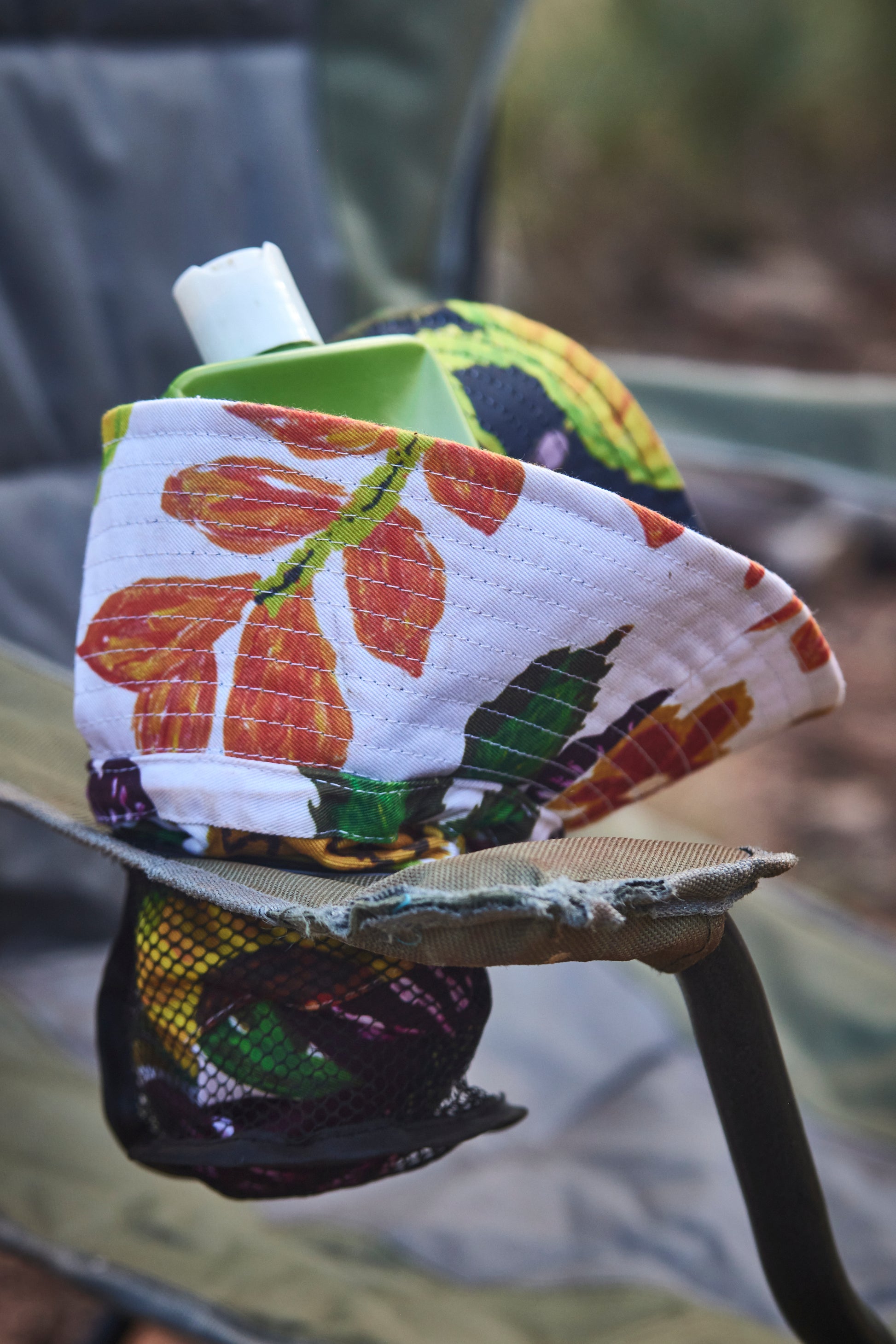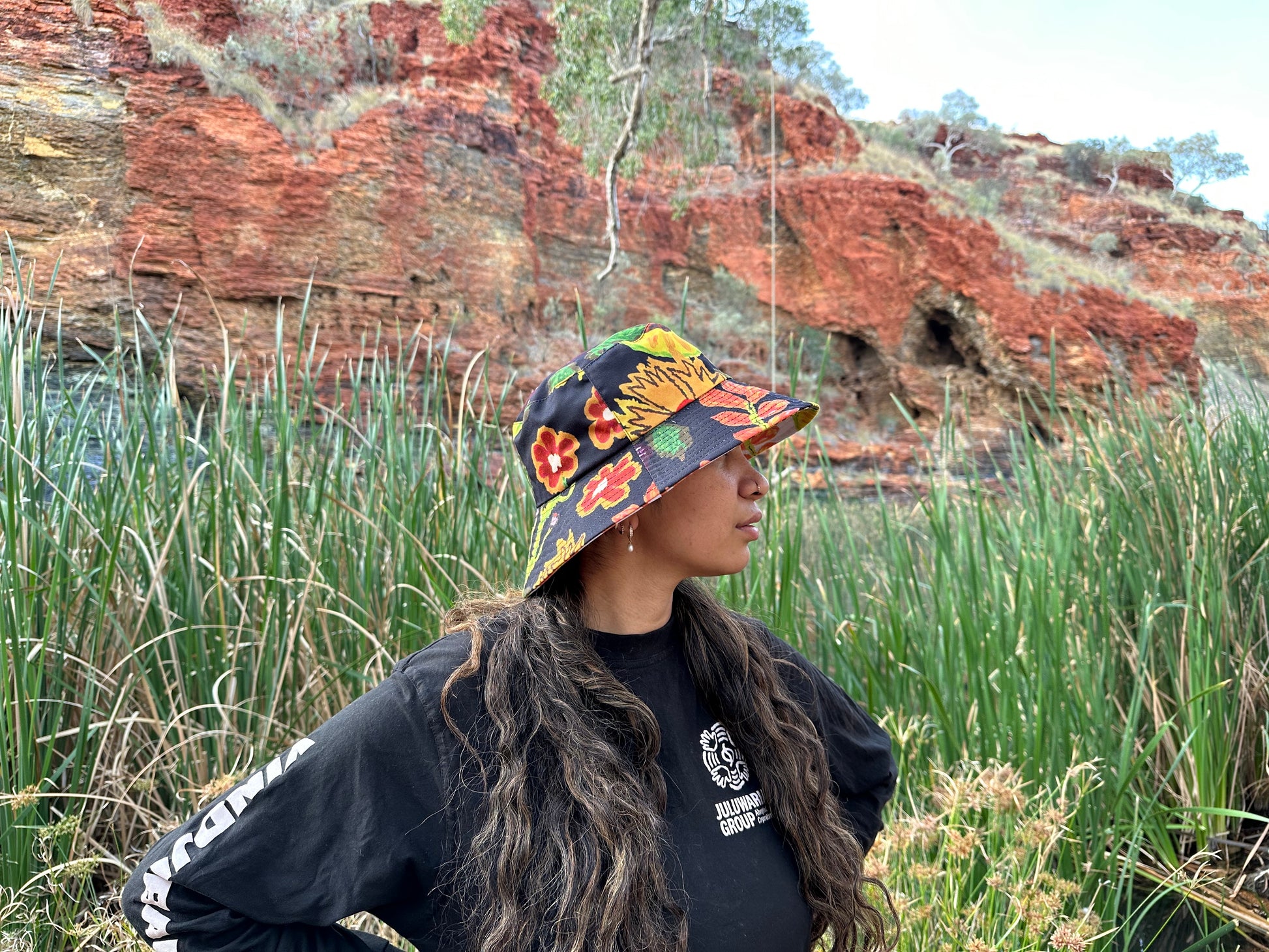 This hat was created using a design made using a number of elements of original artworks by Mrs Read, who loved to paint the all the native flowers and fruits that could be found on Yindjibarndi country. For her, painting, country and wellbeing went hand in hand and she was a brilliant and fierce artist who fought bravely for her country and her people.