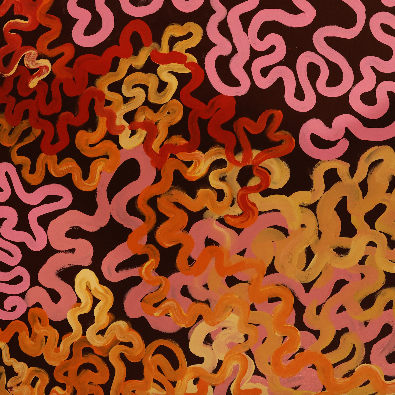 Yindjibarndi cultural knowledge from the Millstream Tableland. Tootsie was born at Yarraloola Station near Pannawonica and grew up in Onslow, living at the Old Reserve and the Onslow Hostel. After attending high school at the United Aboriginal Mission Hostel in Derby, she returned to Onslow and worked as a domestic cleaner at the Hostel and later at Yarraloola Station and Nanutarra Station with her extended family. Tootsie has lived in Roebourne since 1970 and is a committed contributor to the Roebourne community. Tootsie is a founding member of Juluwarlu Art Group, is a board member and broadcaster at Ngaarda Media, is involved in song, video and performance arts with Big hART, and holds a Graduate Diploma in Aboriginal Community Development from Curtin University. Tootsie began painting 10 years ago as a means of healing after the death of her son, and depicts Yindjibarndi stories, rivers, plants and seasons.