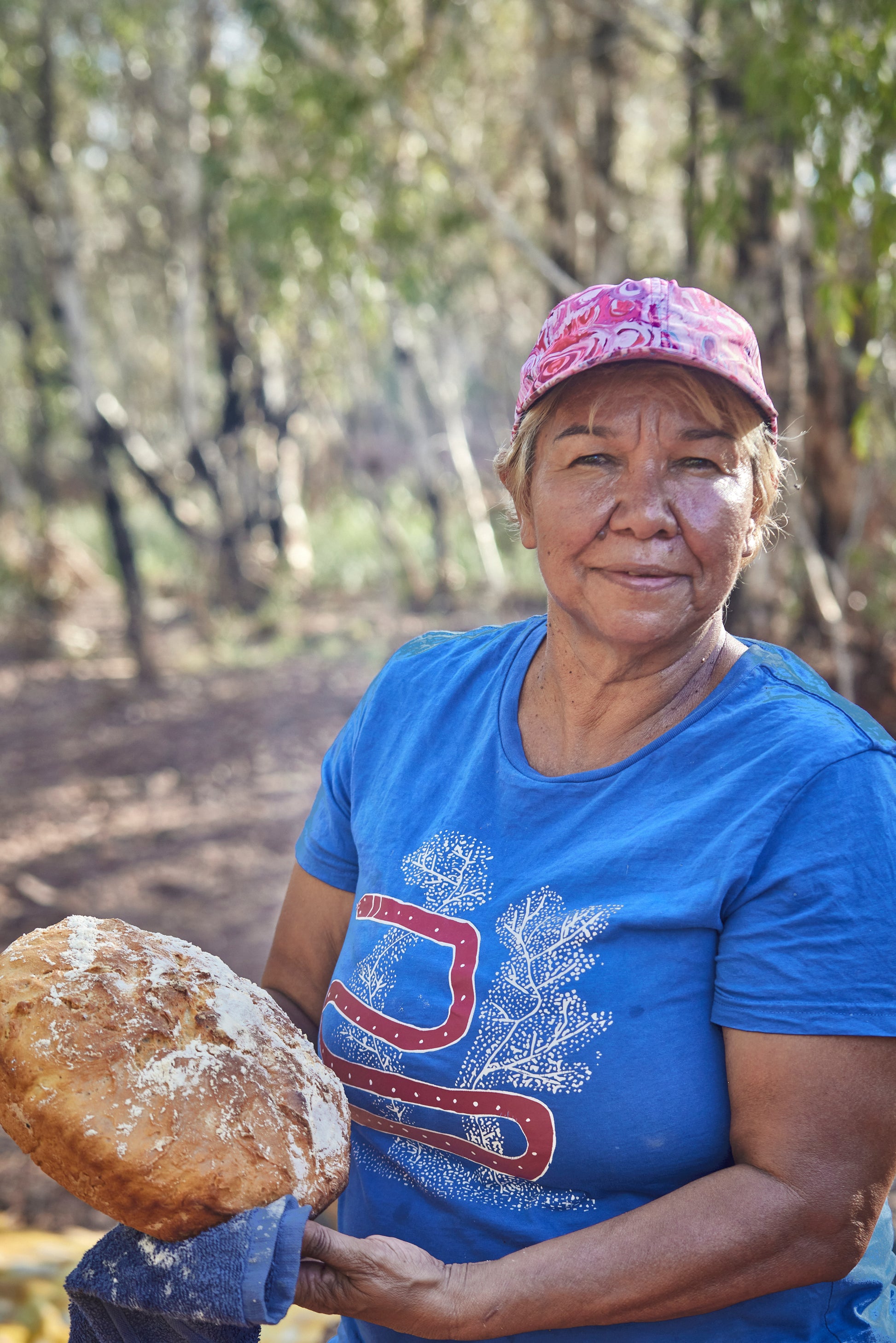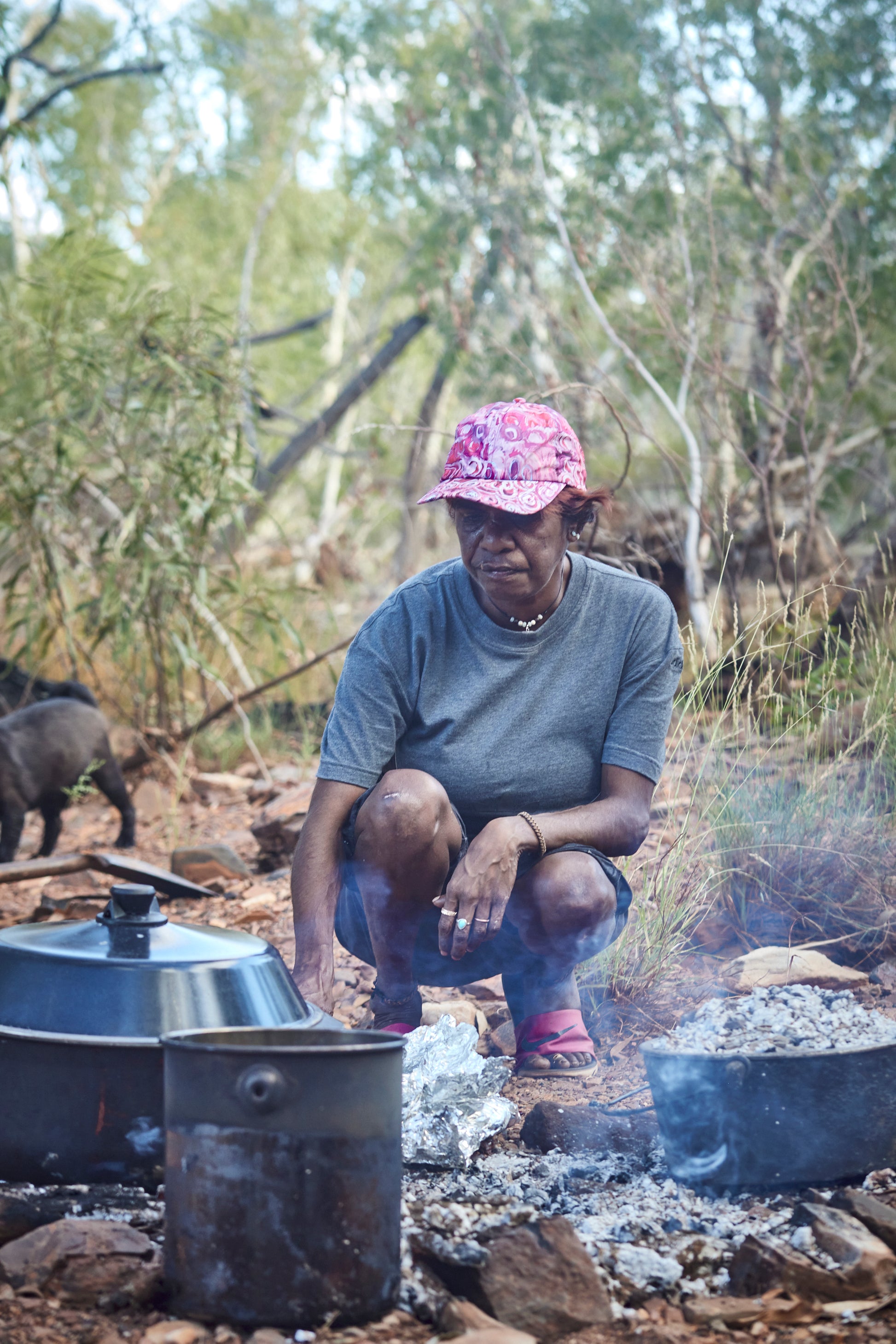 Based on an original artwork by Judith Coppin called The Malyaari Seven Sisters Story, Two Mungga Ant Hills Surrounded by the River.