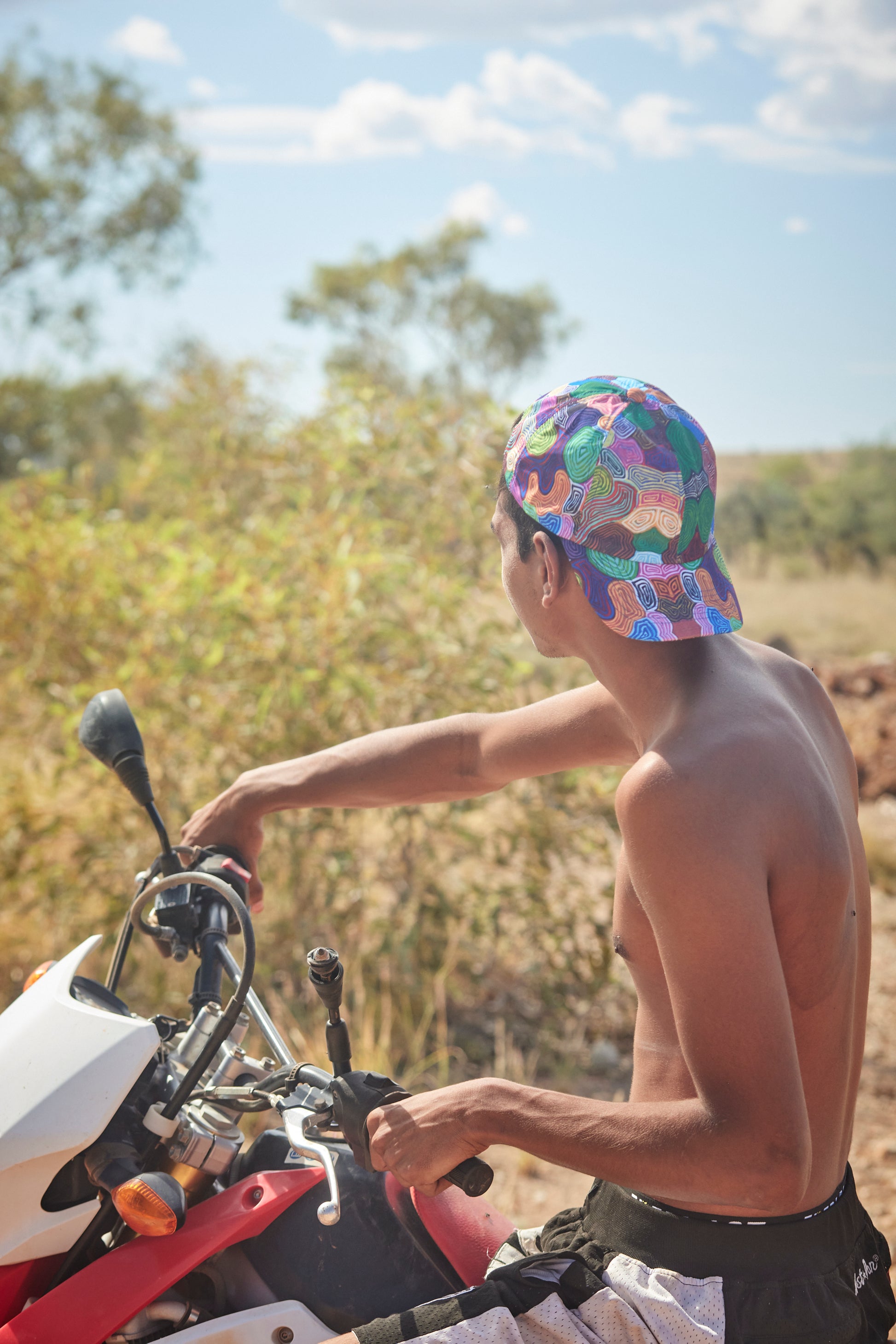 Based on an original artwork by Rocky Pools by Aneisha Larry and her grandmother, Judith Coppin. Judith paints with her grandchildren as a way of teaching them about their country and important cultural information she needs to pass down. It gives the younger people an opportunity to learn about their culture while giving them the confidence to explore painting.